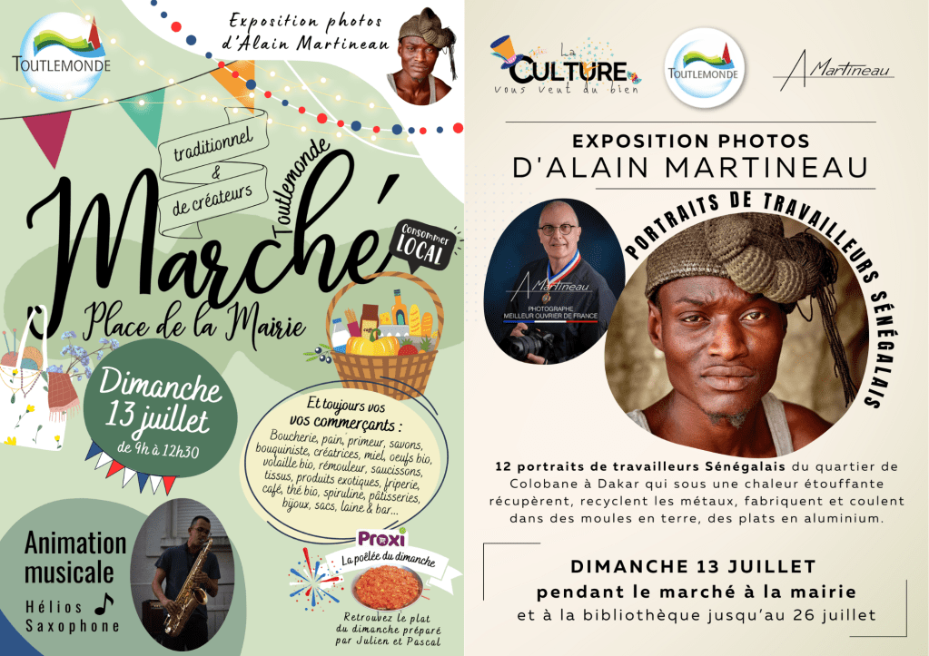 L’exposition du mois, toujours présentée par cette même association aura comme invité Alain Martineau. Nous avons la chance d’accueillir ce photographe, meilleur ouvrier de France, qui nous fait confiance depuis plusieurs années. La collection de photos grands modèles « Travailleurs sénégalais » sera exposée dans la mairie pendant le marché. Elle continuera sa vie jusqu’à fin juillet à la bibliothèque aTout’lire de Toutlemonde.