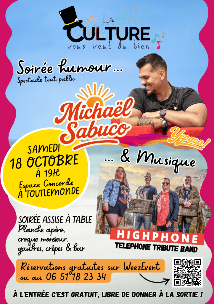 L’association La Culture vous veut du bien aime changer de genre et de lieu pour ses événements. En voici un à ne pas rater le samedi 18 octobre à l’Espace Concorde (salle de sport) à Toutlemonde à 19h. Nous avons invité l’humoriste d’envergure nationale Michaël Sabuco pour un spectacle “tout public” et le groupe Highphone tribute band Téléphone. Préparez-vous à vivre une très belle soirée.