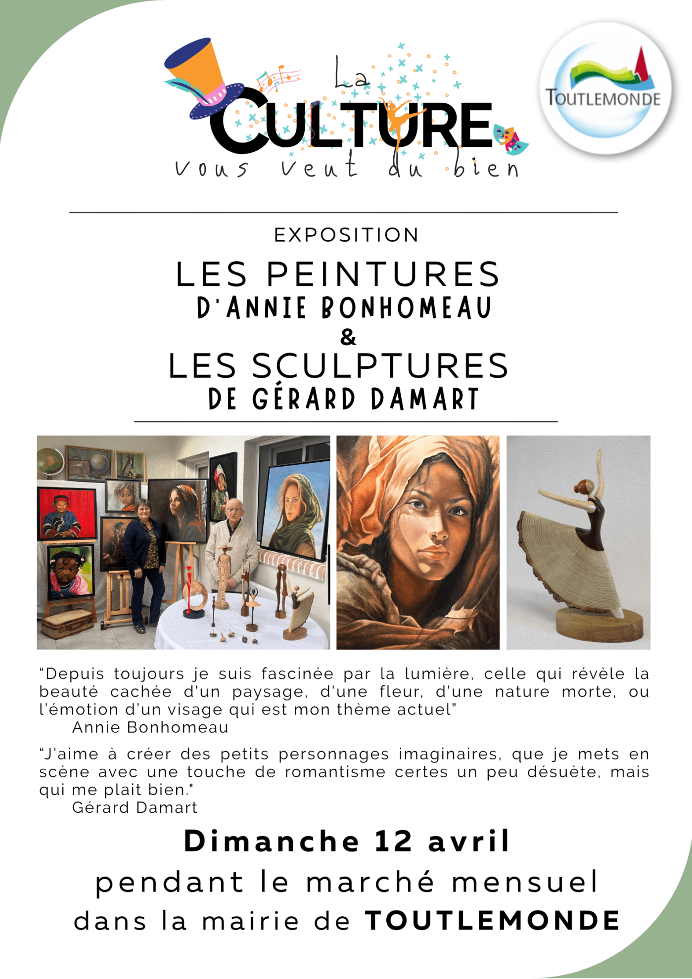 Comme chaque mois, la Municipalité et la Culture vous veut du bien s’associent pour cet événement qu’est devenu le marché mensuel de Toutlemonde et son exposition artistique. On en parle au delà, bien sûr, des frontières de la commune. Une trentaine de commerçants seront présents. L’exposition du mois vous permettra d’admirer les oeuvres d’Annie Bonhommeau, Grand prix du public au salon des arts de Cholet en 2025.